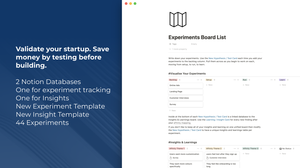 The '#Visualise Your Experiments' board keeps your team aware of what experiments they are running to reduce the risk in your business. The '#Insights & Learnings' board tracks learnings from your various experiments